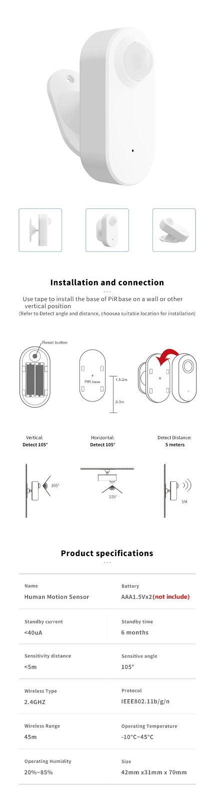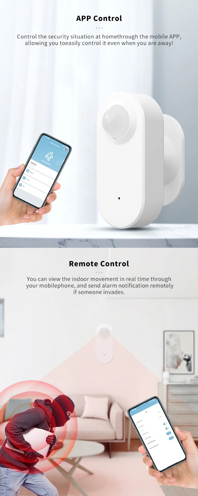 Descubrí el sensor de movimiento WiFi TUYA, fácil de instalar y con notificaciones en tiempo real a través de la APP TUYA. Este sensor autónomo se conecta a tu red WiFi en solo un minuto y ofrece un ultra bajo consumo de energía, con una duración de batería de 8-10 meses.